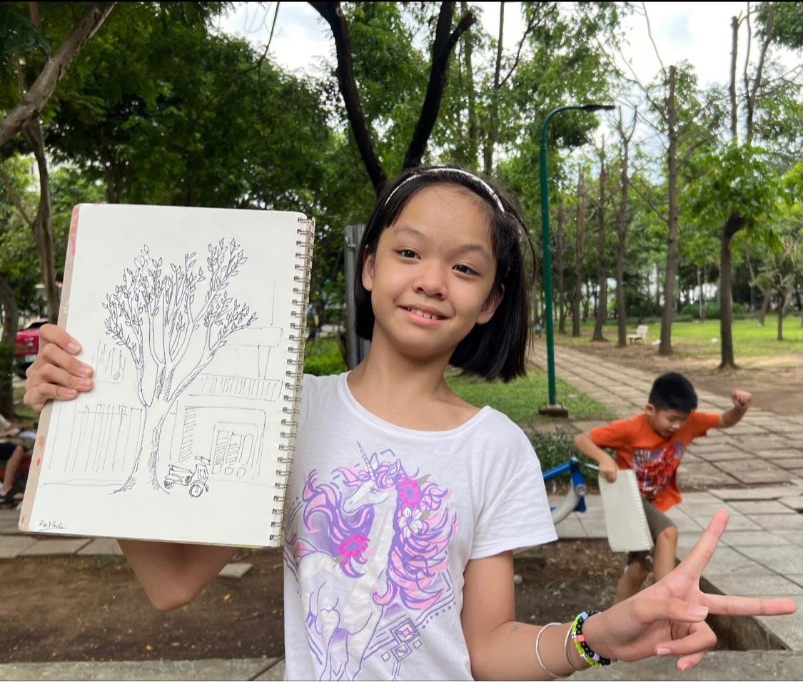 Các bé được đi vẽ ngoại cảnh, ký hoạ bút sắt rất tự tin khi thể hiện tài năng của mình.